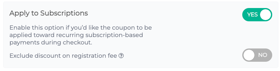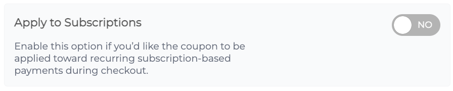 On the Add Coupon screen, you’ll see a toggle labeled Apply to Subscriptions. This setting determines whether your coupon can be used with subscription-based activities.