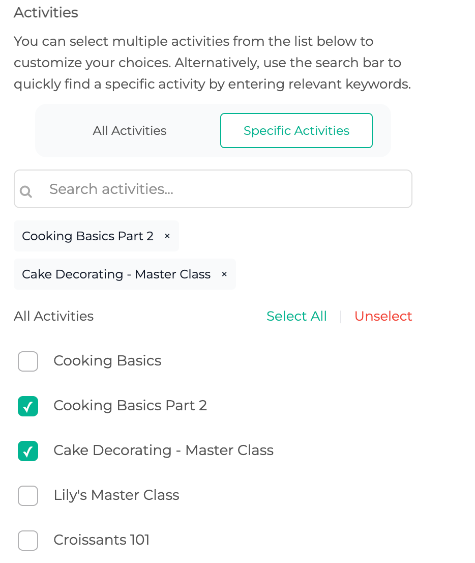 🚫 Activities with no registration fee and no subscription (such as Attendance Based Billing activities or payment plans) cannot be selected.