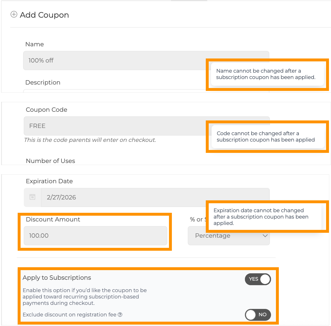 Once a coupon has been used at least once, certain fields and actions become locked to protect existing payments.