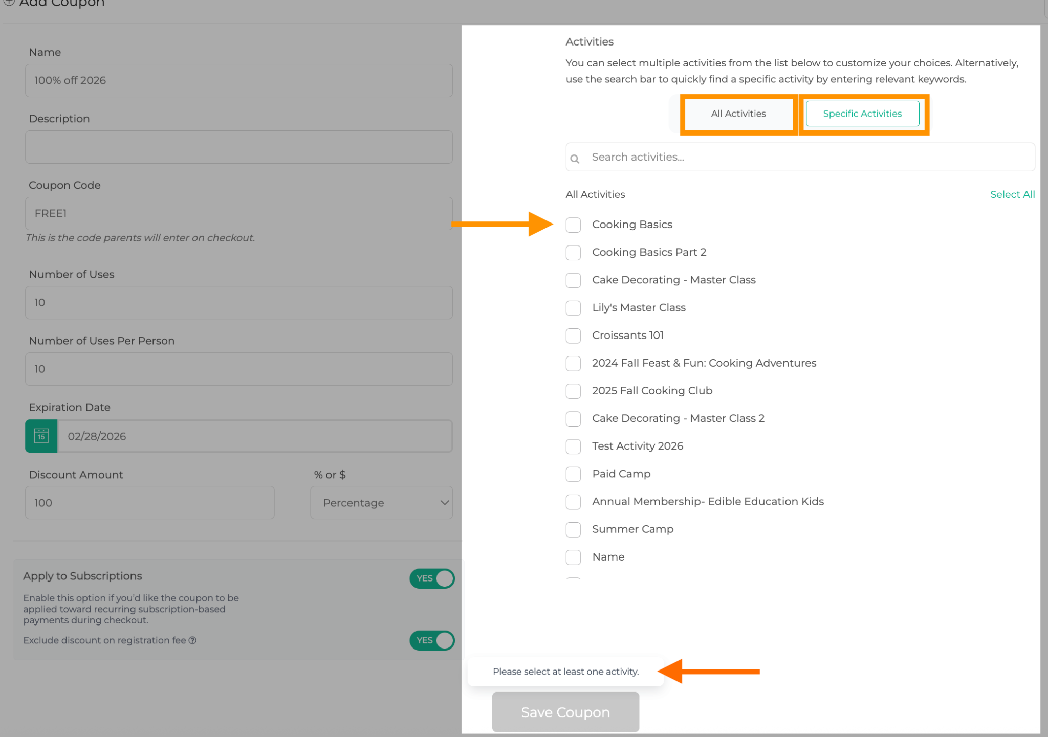 If you have questions about using coupons with subscription-based activities or need assistance, our support team is happy to help.