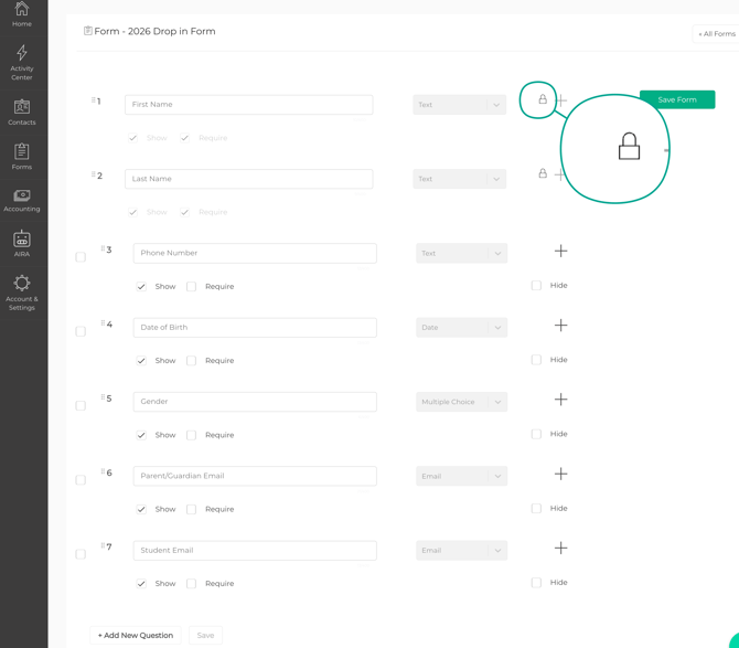 Review the standard drop-in form questions: Some questions are locked and cannot be removed. These are required to add a student to the roster: