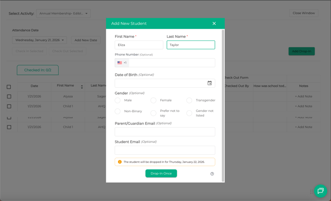 Drop-In is for attendance tracking only. It does not replace registration or payment flows. If you need to collect payment, the student should complete your normal registration process.